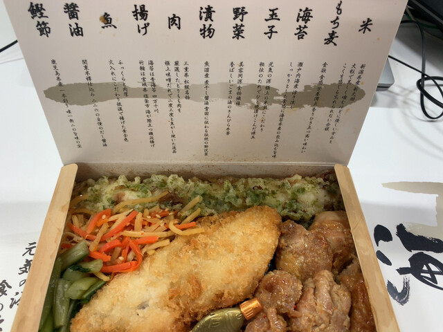 ちくわの磯辺揚・白身魚フライ・鶏肉・鰹節・きんぴらごぼう・高菜・半煮卵・海苔が上下に1枚づつ計2枚ご飯は麦ごはんと健康志向ですかね。お醤油も出し醤油とこだわりの金色醤油さし(魚型)に入ってます。タルタルソースは別売り50円。