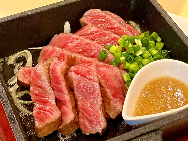 美しい色味の牛モモ肉、上にうずら卵の卵黄、ねぎと刻み海苔、下には大葉とオニオンスライスという構成。