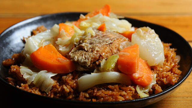 チェブジェン1500円 セネガル発季節の魚のパエリア風 揚げ魚、トマトベースのソースが美味しいトップセラー。