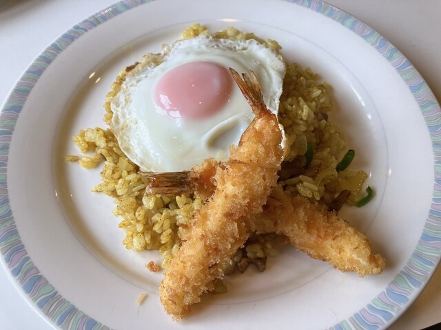 ②お料理について ハンバーグやカキフライなどメニュー豊富で 迷いましたが、ここは初志貫徹。 “わか風オムライス(ドミグラスソース)”に “エビフライ2本”をトッピングして注文。 暫くして、上品な柄の丸皿にオムライスと エビフライが乗って供されます。 エビフライは、小ぶりですが、プリッとした 食感で、海老の甘みを十分に感じられるもの。 サクサクとした軽やかな衣も私好みです。 オムライスは、バターライスにトロリとした オムレツが乗り、その上に濃厚で深みのある ドミグラスソースがかかっています。 そして、個性的なのがドミグラスソースに 加えられているピーマン。シャキシャキした 歯応えやほろ苦さがあり、存在感ありました。 ボリュームはやや少なめですが、最後には 薫り高いアイスコーヒーも頂いて、満足感は 十分ありました。