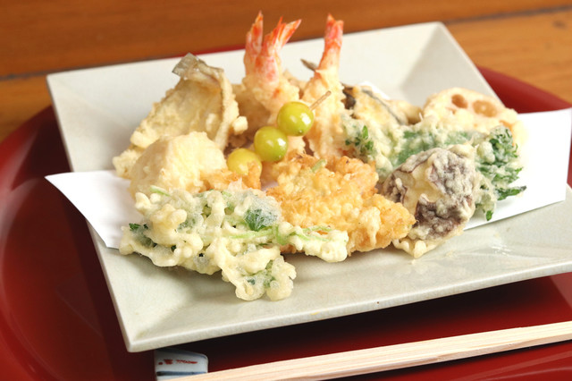 突出し2、海老5、魚4、季節野菜、かき揚、赤だし、香の物、果物。