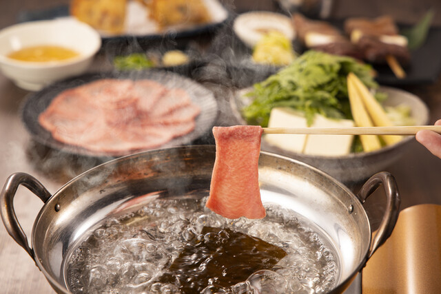 【これだけは頼んで!メニュー】 牛タンしゃぶしゃぶは絶品です。分厚い牛タンと甘めのつけだれスープが絶妙なバランスで、ぜひ味わってほしい一品です。