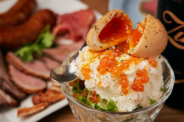 ◯燻製たまごのトローりポテトサラダ 半熟味玉と豪快いくらのせで、崩して混ぜ混ぜ これもしっかり燻製の香り!