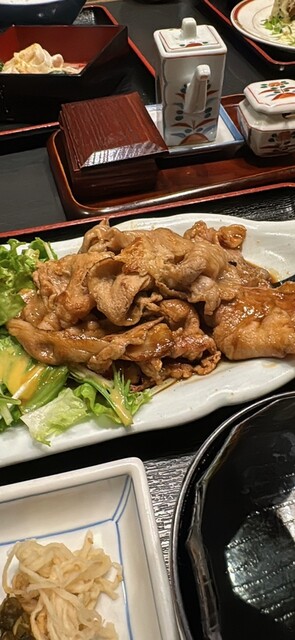 会議前の昼食探し。ウロウロしていたら発見! ここでいいんぢゃね?みたいなノリで入店。 初訪問かと思いきや6年振りの再訪問w 記憶にございませんねぇ( ´﹀` ٥ ) 店内に入ると何だかバタバタしてますね。。。 あぁ。開店直後で忙しいのか。仕方がないねぇ。。。 奥のテーブル席へ案内されました。 なんか微妙に狭いですね ( ´-ω- )セマセマ 何はともあれメニューを拝見。 「お昼のご飯」と書かれたメニュー表。 八種類から選べという事かな? よく分からないので「豚ロース生姜焼き」(1100円)を 注文致しました (∩´∀`∩) 三分後、まず最初に前菜?登場! バリバリ食べて完食。 そこから12分後に生姜焼き定食の登場です (≧◇≦) おぉ!?結構な量ですねぇ。 味噌汁は豚汁かな?具材が豊富です (●´ω`●) 里芋とほうれん草の椀物、マヨネーズ付き葉野菜。 微妙な香の物、味付けの濃い生姜焼き。 若さ溢れる若者向け料理ですね (^_^; 味は可もなく不可もなくって感じでした。