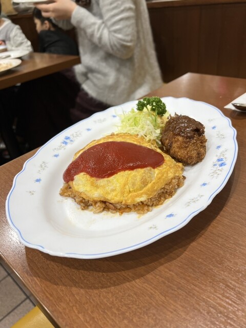 オムライスにクリームコロッケが付いてオムコロ。 あらかじめショーケースで見ていたオムライスのサンプルが良かったので注文しました。 5分くらいで運ばれました。 サンプルとは違って、よく中華料理店にあるオムライスっぽい感じ。中のチキンライスは遠くにコンソメらしい風味も感じる上品な味でとても美味しいです。ケチャップの酸味との相性もとてもいいです。 それとともに良かったのが、クリームコロッケ。すごく味に深みがあって、こちらも上品ないい出来でした。生涯でも1、2に入るクリームコロッケでオススメです。 ご馳走さまです。 |