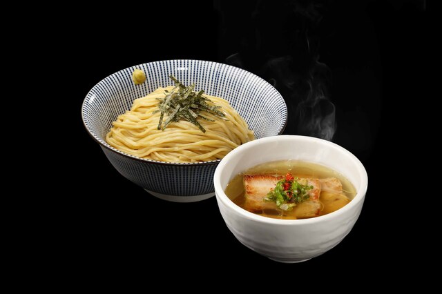 券売機で買ったのは味玉塩つけ麺 中盛り1100円。 カウンターの右端に座ると10分弱で着丼しました。