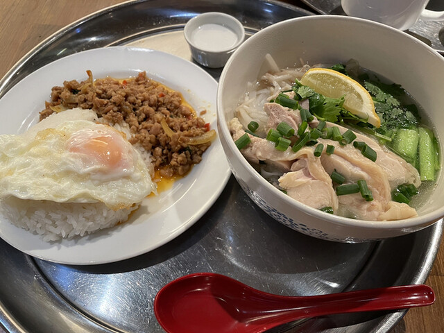 結構な人気のお店でしょうか。 ほぼ満席になります。 こちらは以前にチキンビリヤニをいただきましたが、評価し忘れたままです。結構美味しかった。 ランチタイムでも沢山の中から選べるので、目移りしてしまい決まらない。エイヤー、で日替わりランチにしました。 パッタイ初めて(^-^)/楽しみ。 セットなので、サラダとドリンク(マンゴーラッシーにした)とミニミニタピオカデザートが付きます。 程なくして供出されます。 先にパッタイを頂きます。へぇ〜、結構美味しい。好きな味です。優しい味わいです。新しい発見だ。今度はコレの単品にしてみよう。タイ料理にしては、全く辛くない。 トムヤムヌードルは、もうちょい辛くてもいいかな。 また来たいお店です。 |
