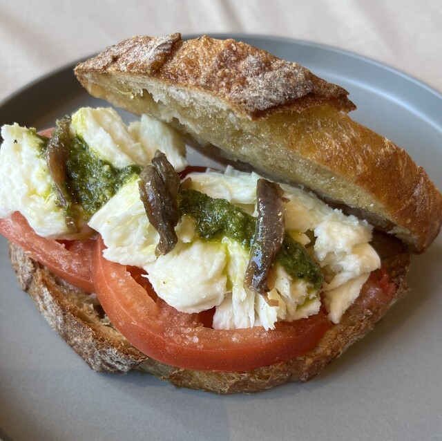 一皿目は、ブッラータチーズと中本シェフの地元・宮崎県産の甘いトマトに、熟成生ハムという贅沢な組み合わせのカプレーゼ。