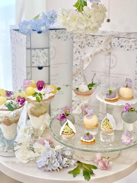 | 紫陽花が咲き乱れる店内でパールをあしらったグラスのティラミスやマカロンなどパープルカラースイーツが並ぶ大人かわいいアフタヌーンティー